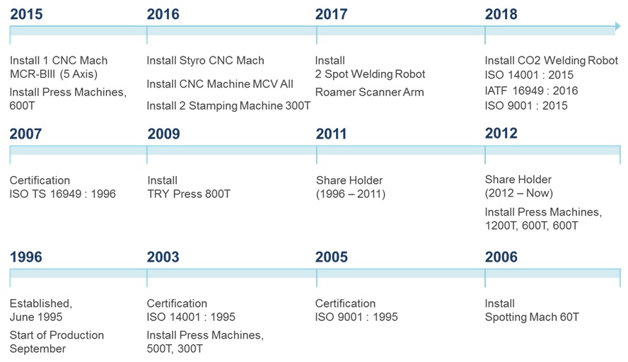Our core businesses are providing services in dies, jigs and fixtures manufacturing, parts stamping and sub-assembly welding. In our Karawang Plant, we have modern machineries, facilities, including computer aided manufacturing backed by design experts to suit customer needs.
